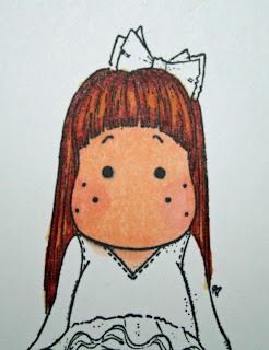 This is my first attempt at a tutorial for the copic markers. I get a lot of questions on how I get the Auburn colored hair that is my favorite. In these pictures, I used five colors of Copic markers. For the skin, I used E00, E02, and R20. For the hair, I used YR21 Cream, and E08 Brown. I am simply showing you the way I personally color my stamps. There are lots of other ways out there to achieve a wonderful finish to your poject. I must give credit to some of the other wonderful artists out there, that have taught me so much. Two of them in particular - Claudia Rosa and Suzanne Dean. They have some amazing Copic tutorials on their blogs and I highly recommend you watch them. Ok, on to my process. Don't forget that you can click on the photos to look at them up close. I apologize in advance for going outside of some of the lines. I didn't use my color blender to remove my messes.