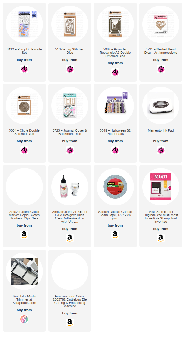 I just love the Halloween season! It's just so fun! I am always sad to see the wonderful days of summer leave, but Halloween sure helps with the transition! I've always loved spooky ghost stories and the idea of ghosts and such! I've got a cute little "too cute to spook" tag to show you today. I just love the new Halloween sets from Art Impressions! All of the critters are so adorable! Today I chose to use #6112 Pumpkin Parade Set and that adorable ghost kitty!! I started out by grabbing #5132 Tag Stitched Dies and cut out my base, then #5062 Rounded Rectangle A2 Die Set to make couple of mats. I cut a second tag out using #5849 Halloween S2 PP, and then trimmed off the top using one of the dies from #5723 Journal Cover and Bookmark Die Set to add to the top of the gray base tag. I stamped the kitty and candy onto Copic friendly cardstock and colored them with Copic markers. When done with that, I used the included dies from the set to cut them out. I LOVE having matching dies to stamp sets!! It's really nice not to have to fussy cut the images out! I added a heart that was die cut with #5721 Nested Heart Dies and stamped the sentiment onto a circle die cut using #5064 Double Stitched Circle Dies.
