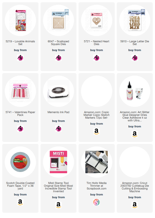 I started by grabbing the cute elephant from 5219 Loveable Animals Set. I'm sure you've heard of pink elephants on parade (LOL). I told you I love the pinks and reds!! I colored it with Copic markers which are listed below. The dies are included with the stamp sets, so it made it super easy to die cut it. It also cuts around the paws so it can hold whatever you want to put there. I added a couple of balloons that were from dies in my stash. I wrapped the balloon strings around his arm too. The mat was created using #6047 Scalloped Square Dies and placed on the diagonal. I then grabbed #5721 Nested Heart Dies to cut several sizes of hearts. There's lots of dimension as I popped up just about everything from the layer underneath it. I placed a die cut heart into the hands of the pink ellie and tied the balloon strings to one of the arms. Finally, I used #5910 to cut out four X's and four O's (two each in red and then pink) and used them to finish the card.
