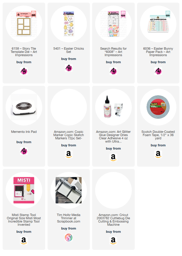 I have been loving seeing all the amazing creations using the new #6158 Story Tile Template Die from Art Impressions! It's soooo versatile! I'm using it yet again today for a cute Easter card. Easter is just around the corner, so it's that time! For the chicks, I used #5401 Easter Chicks Set. I stamped the images onto a Copic friendly paper and then colored them using the markers listed at the bottom of this post. For the single carrot and the basket of carrots, I used #6008 Bunny Hugs Set. Both sets come with the dies, so it was super simple to add them to the window tiles. The paper is from 6036 Easter Bunny PP.