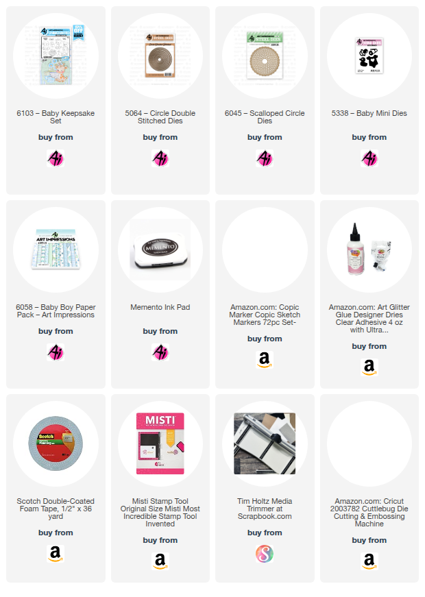 I don't know what it is about cute baby animals, but I usually love coloring them different colors. Call it artistic freedom, or being just plain silly...but you can call it me. LOL! I usually have to color them at least once in a non conventional color. For this one, I chose to go the route of blue and green (I just love that color combination). I started by stamping this adorable giraffe from #6103 Baby Keepsake Set onto a Copic friendly paper and coloring him. After that, I die cut him out using #5064 Double Stitched Circle Dies and matted them with #6045 Scalloped Circle Dies. That cute little onsie and diaper pin (do people even know what diaper pins are these days???) were die cut using #5338 Baby Mini Dies. Those Mini Die Sets are perfect for card accessories!! This card fits in perfectly with out current Round and Round Challenge, all the way down to the little round button I added to the center of the bow! Don't you just love that adorable paper? It's from #6058 Baby Boy PP and I LOVE it! Wouldn't it be so perfect to make a journal with it? It comes in a cover pack so you can use it for the journal cover too!