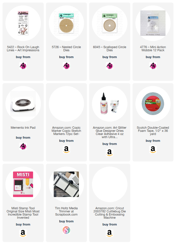 I have a card to show you today that I made for Challenge #425 I See Right Through You. What a fun challenge!!! I want to apologize for the glare on the pictures from the acetate I used. I tried everything and just couldn't remove them. I am NOT very proficient with the tech side of things. LOL! But the card looks pretty cool in person. To make the front, I actually just used one of my cover plates that has a thin frame around it. I cut two of them and sandwiched a piece of acetate between the two pieces. I mean...could it get any easier than that?? I then cut the back of the card making it just 1/4" wider and scoring it at 1/4" to glue to the inside of the front. For the fun Rockin' Granny from #5422 Rock On Laugh Lines, I started by stamping her in Memento Tuxedo Black Ink and coloring her with Copic markers which are listed below. I then fussy cut around her so I could place her onto a mini wobble. I mean...a Rockin' Granny needs to be on a wobble, don't ya think? LOL! In order to place her onto the card, I needed a base panel, so I used #5726 Nested Circle Dies and #6045 Scalloped Circle Dies. I cut a set in the same size for the front as well as the inside.